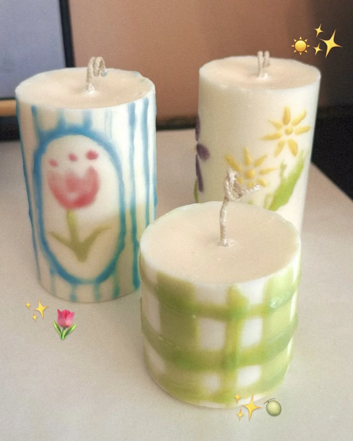 Candles are customized with soy wax-based color, and can be safely burned once decorated.