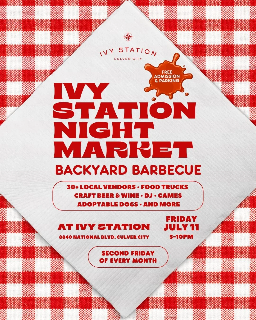 LOCAL VENDORS - FOOD TRUCKS - DRINKS - MUSIC - GAMES - PHOTOBOOTHJoin us for the Ivy Station Night Market happening in Culver City! Shop handcrafted items from dozens of local vendors, plus enjoy food trucks, drinks, games, music, face painting, and more on the Ivy Station lawn. Free admission and easy underground parking!