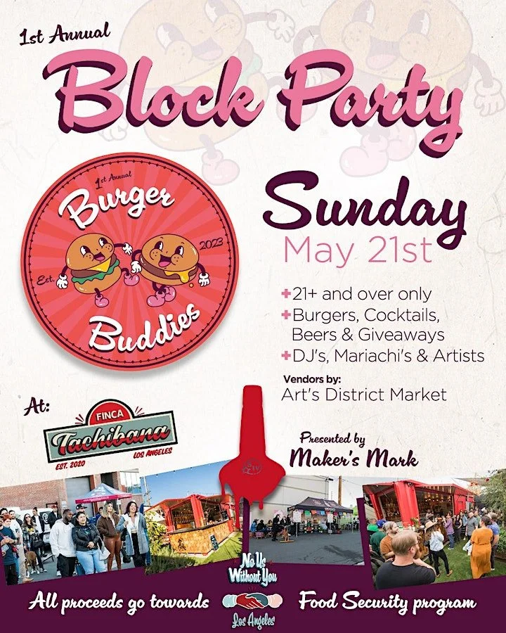 Hosted by Finca Tachibana (which will serve as the VIP area), Burger Buddies features the beloved Burger culture of Los Angeles by closing down Colyton St (between 5th & Palmetto acting as the GA area) to enjoy LA's favorite Burgers, Brews and Spirits while listening to DJs and Maricachis on a Sunday afternoon.